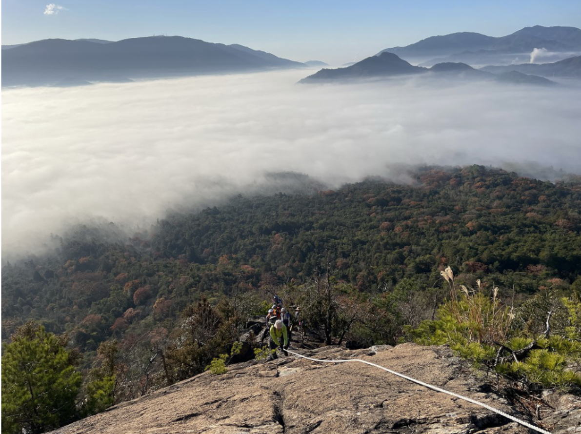 車を分乗して黒瀬町へ。車中から見上げると、小田山が朝日を浴びている。明けきらない早朝に山筋や岩肌を赤く染まり、さながらモルゲンロート風――絶好の登山日和の予感がしました。「十畳岩」に着いたときは皆心地よい疲れで大休憩。見渡すと青空の下、辺りの景色を雲が埋め尽くし、息をのむような――大雲海。微かにかすみが立ち上がる幻想的な景色に、あちらこちらに歓声やため息があがります。岩の連続でした。灯籠岩、亀の背岩、人待ち岩…、大人気(!?)の「男岩」は遠く眺めるだけ。天国岩、手水鉢岩…もっといろんな岩があった思いますが、ぜんぶは覚えきれない。とにかく十分、堪能させていただきました。