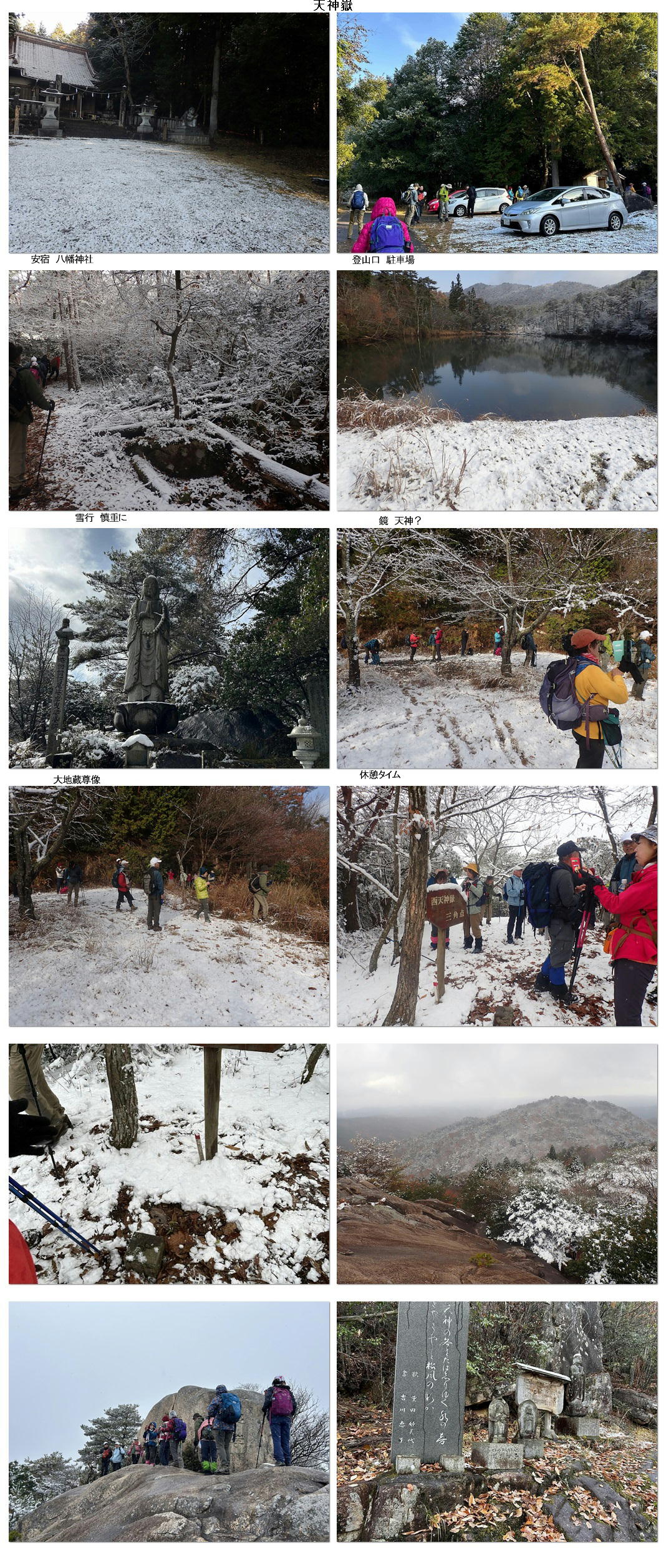-HOMEへ戻る- 歩行時間:3;10時間 歩行距離:6.14km のぼり:452m くだり:429:m 午後、総会開催 総勢26名。朝は小雨が降っていたが集合と共に天気は回復。しかし寒い! 午後は湖畔の里のホールで総会。昼食には評判の油淋鶏(ユーリンチ)弁当。 これを頼りに極寒のコースをいざ!登山口ではさほどでなかったが次第に雪景色。 中腹頃は立派な雪行進、2、.3人は尻餅をついて嬌声。楽しい山行になりました。