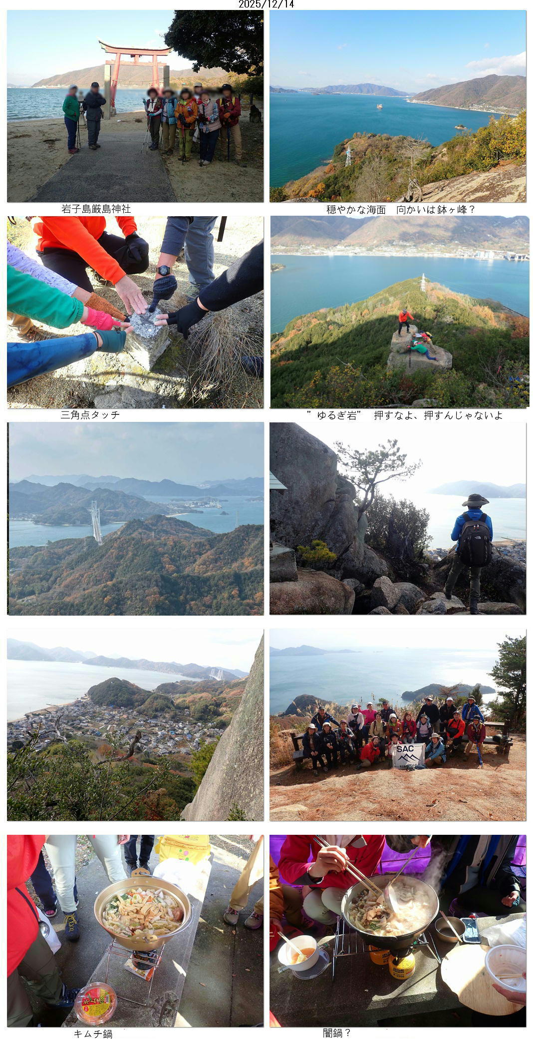 総勢20人。体験者3名。今日の予定の山は尾道向島の高見山、そして毎年恒例の雑煮会を山頂で行うことになっています。高見山はゆっくり挑戦しても1時間かからない山なので、となりの島の岩子島の西岩岳を登ることになりました。標高130mの低山ですが、岩山で眺望も良く、「ゆるぎ岩」など奇岩も楽しめ、三原市方面では鉢ヶ峰がよく見えました。高見山に移動する道中、向島みかんの市場が何カ所かあり、帰路には、是非ここで買い物したいという要望が出て、下山後寄ることに決まりました。